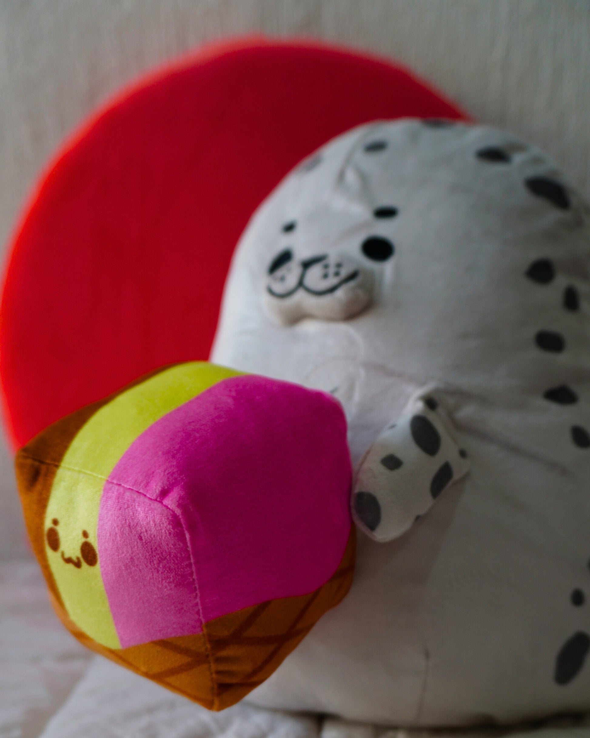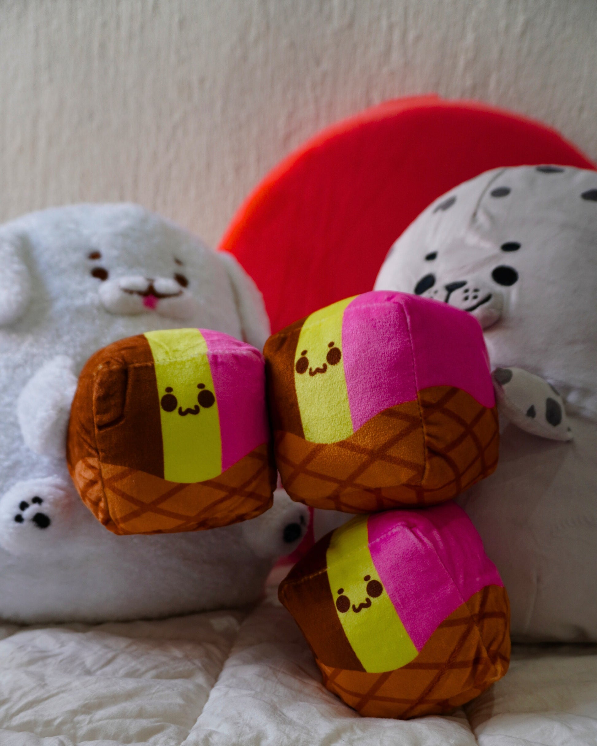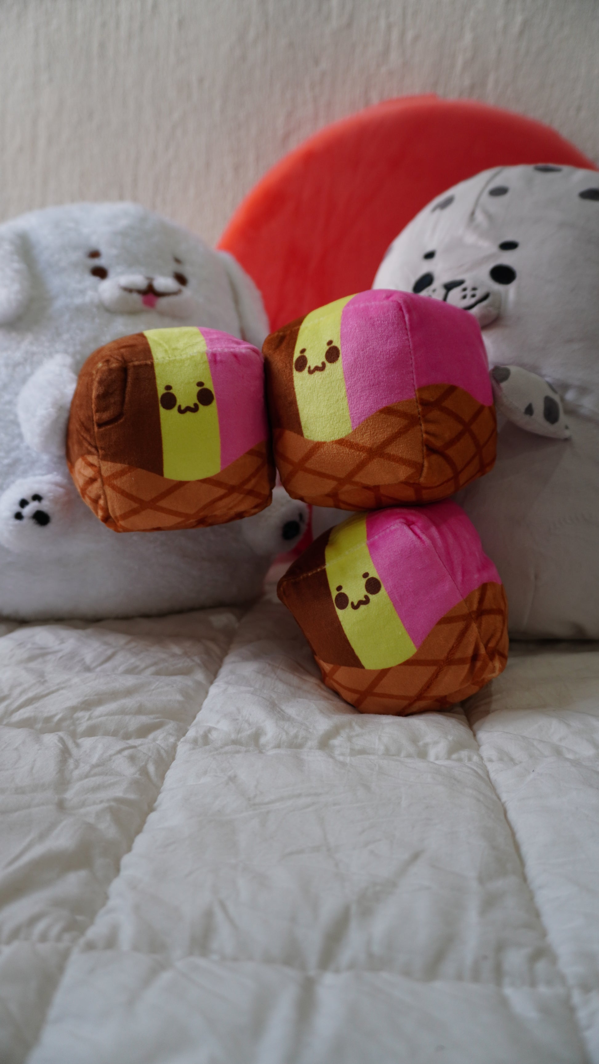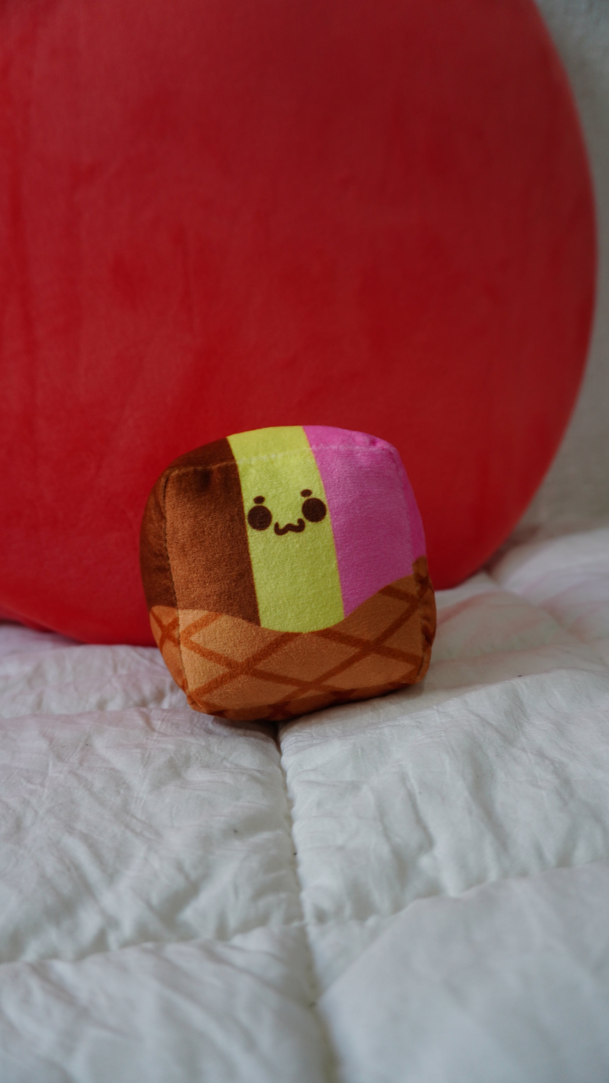 Este adorable peluche en forma de cubo representa un delicioso helado napolitano, con franjas en los clásicos colores chocolate, vainilla y fresa. Con su diseño suave y esponjoso, este Q-boing no solo luce delicioso, sino que también es un objeto consciente lleno de personalidad, ¡perfecto para quienes aman los dulces y los peluches!